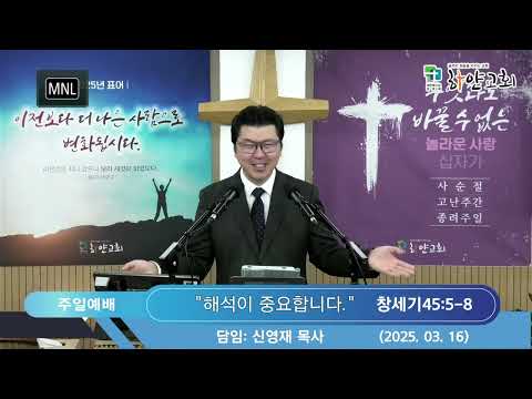 2025년 3월16일 주일예배설교제목 : 해석이 중요합니다.설교본문 : 창세기45:5-8설 교 : 신영재목사인천시 남동구 구월남로342번길 3. 3층 하얀교회