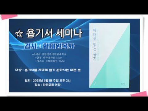 하얀교회 주일 2부 성경세미나*욥기서 1강*강 사 - 황대원목사 (아세아연합신학대학원 대학교, 신학과) (합동 신학대학원, 목회학) (에스…